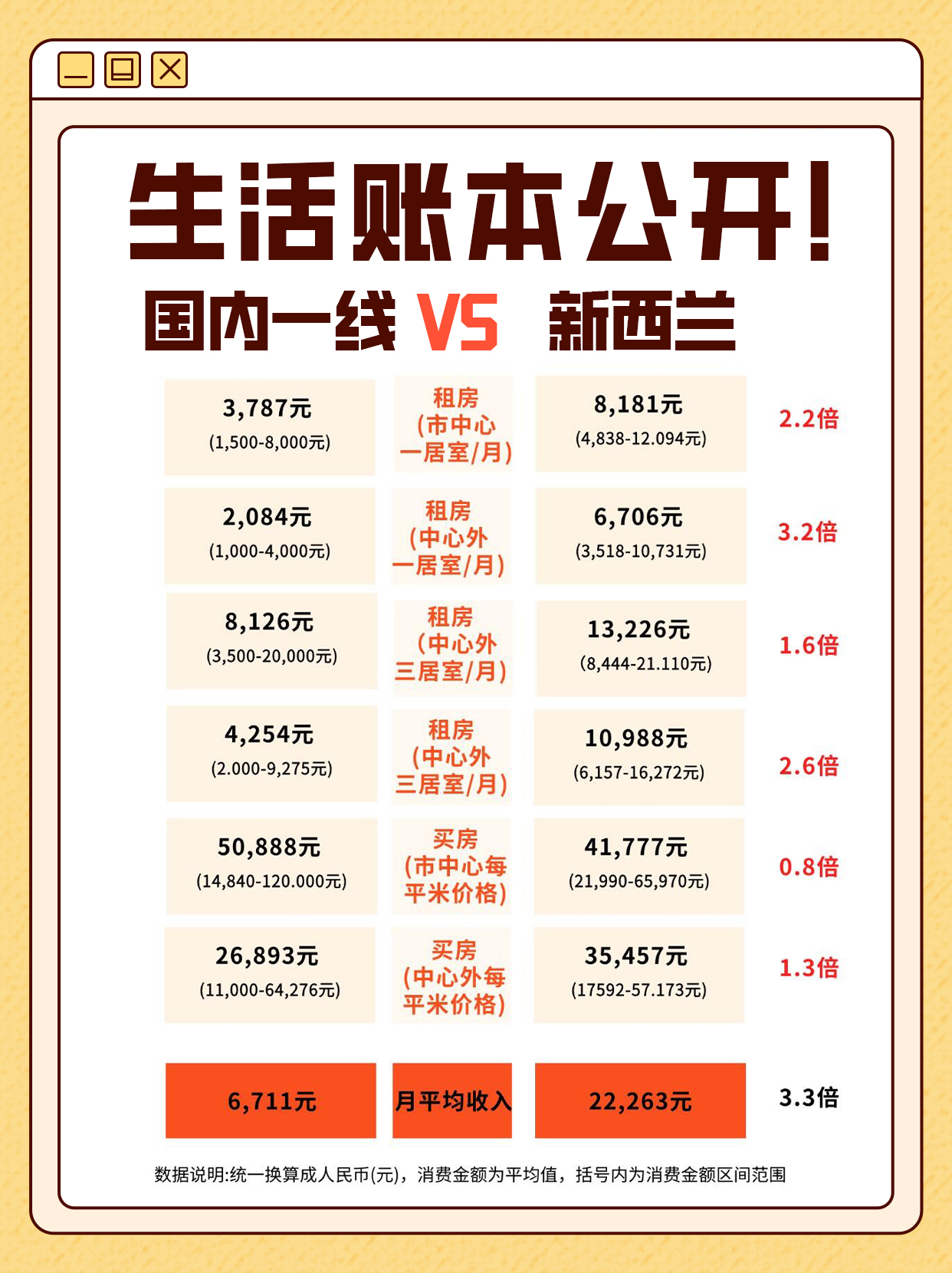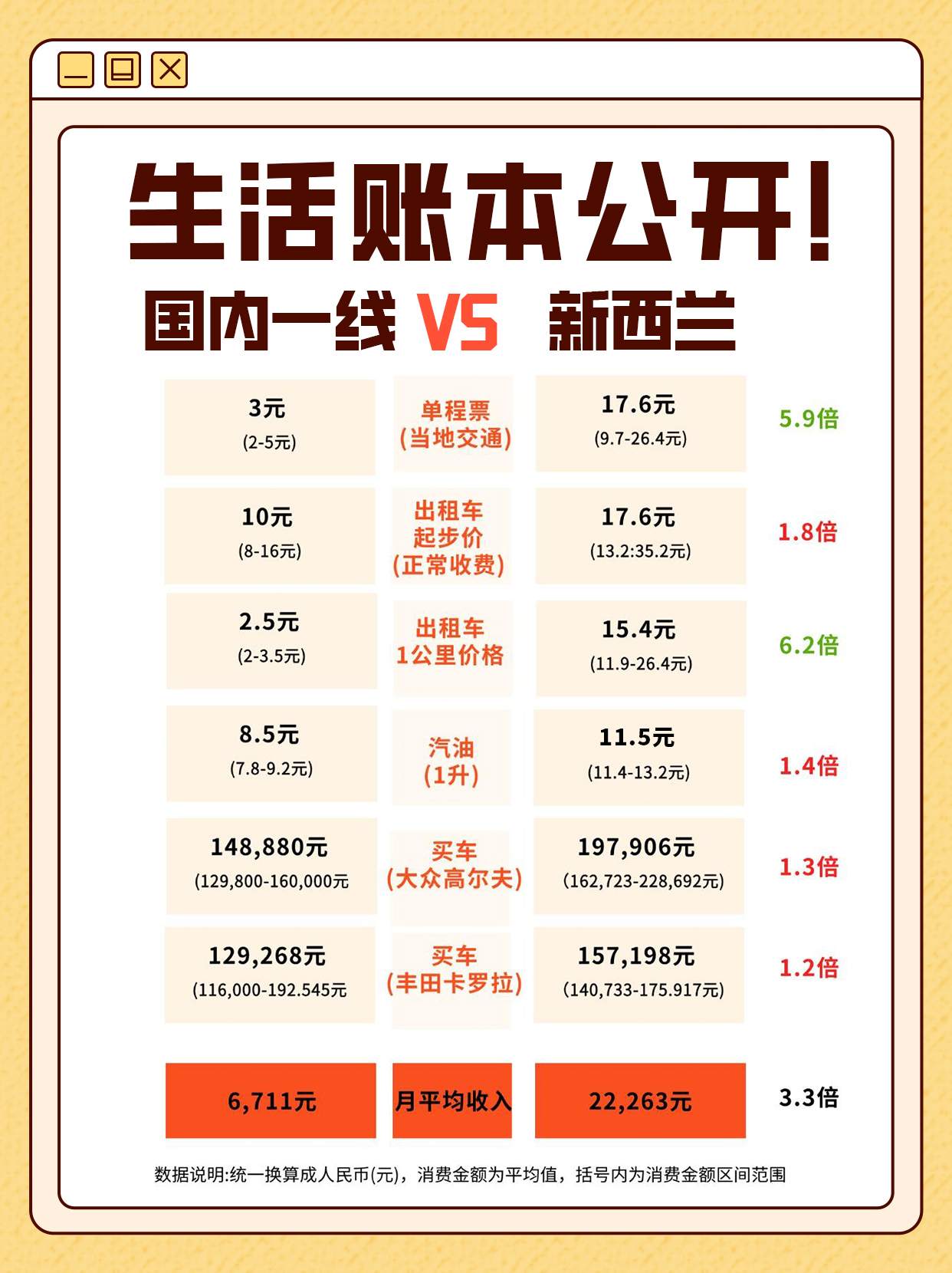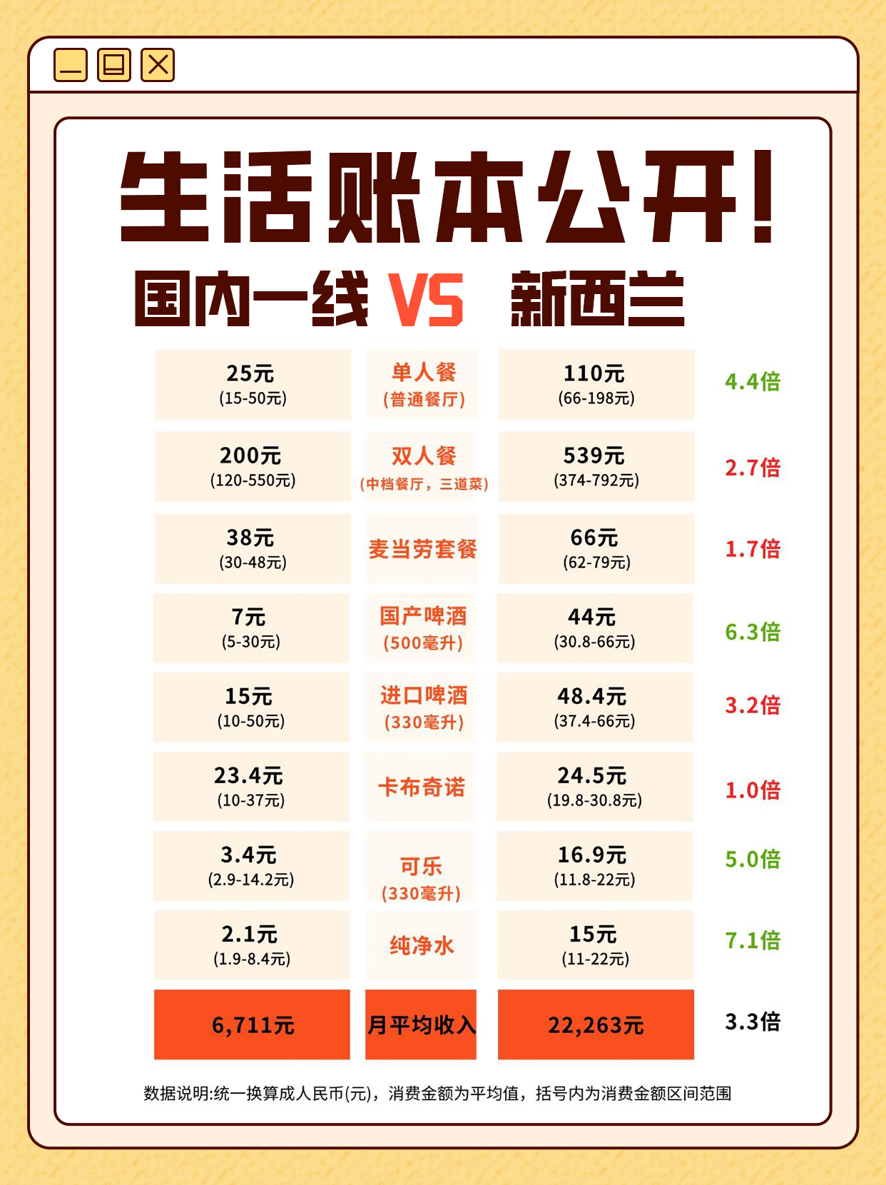 新西兰收入是国内的 3.3 倍,这构成了两国所有消费对比的基本前提——许多商品和服务在新西兰的绝对价格更高,但占其居民收入的比例却可能更低。因此,看待生活成本,绝不能只看价格数字,必须结合收入水平进行衡量。