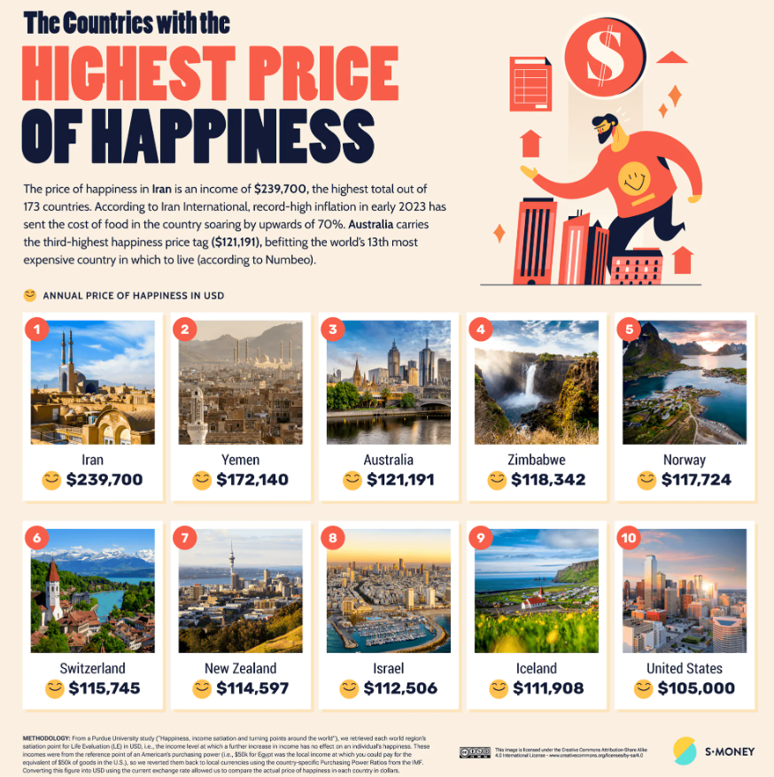 对比邻国更凸显:隔海相望的澳大利亚幸福成本更高,以121,191美元位列全球第 3,相比之下新西兰虽门槛不低,却仍具备相对优势。
