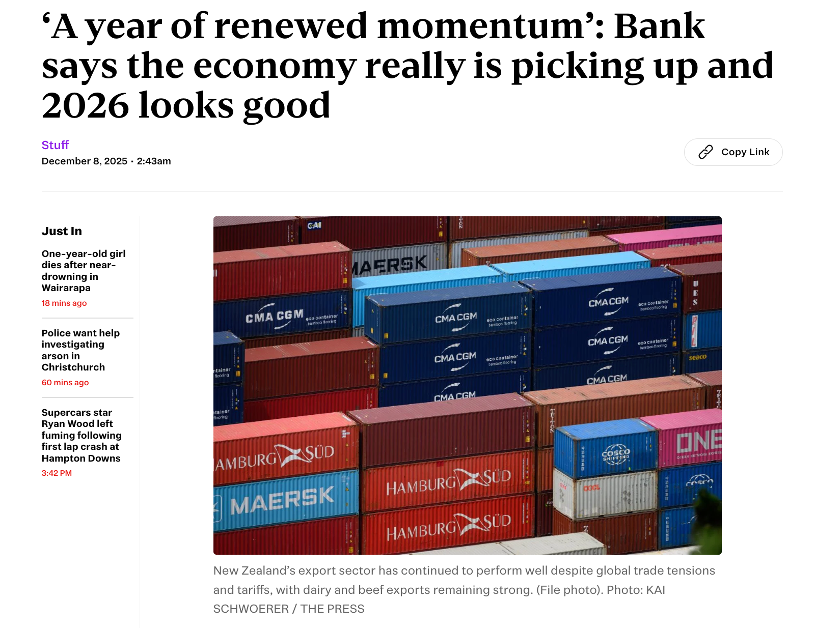 (新西兰最大新闻网 Stuff发布:经济势头再度强劲的一年,2026年前景良好。)
