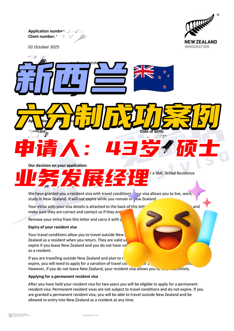 申请路径:凭借海外硕士学历,结合我们为其规划的新西兰本地1年工作经验(我司匹配真实工作),精zhun满足6分制要求,顺利完成规划申请,一年获得PR。