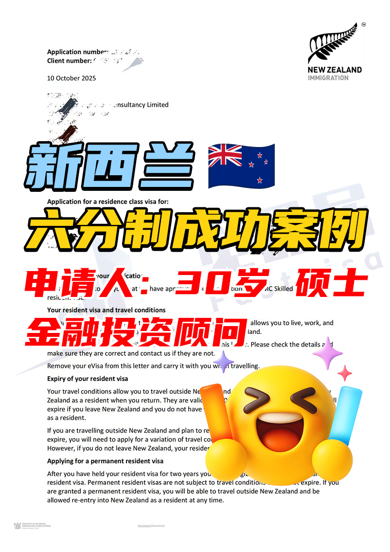 凭借海外硕士学历,结合我们为其规划的新西兰本地1年工作经验(我司匹配真实工作),精zhun满足6分制要求,顺利完成规划申请,一年获得PR。