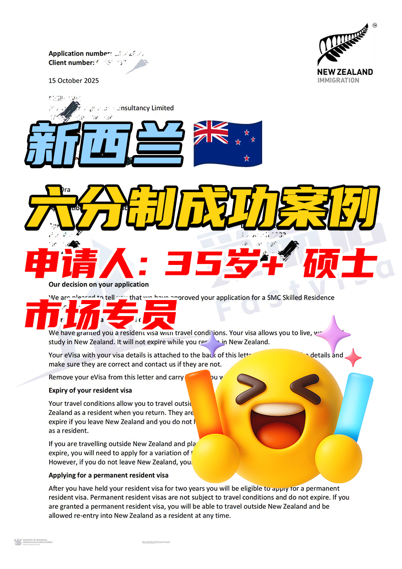 凭借国内硕士学历,结合专业对口的市场专员工作,精zhun满足6分制要求,快su获批居民签证。