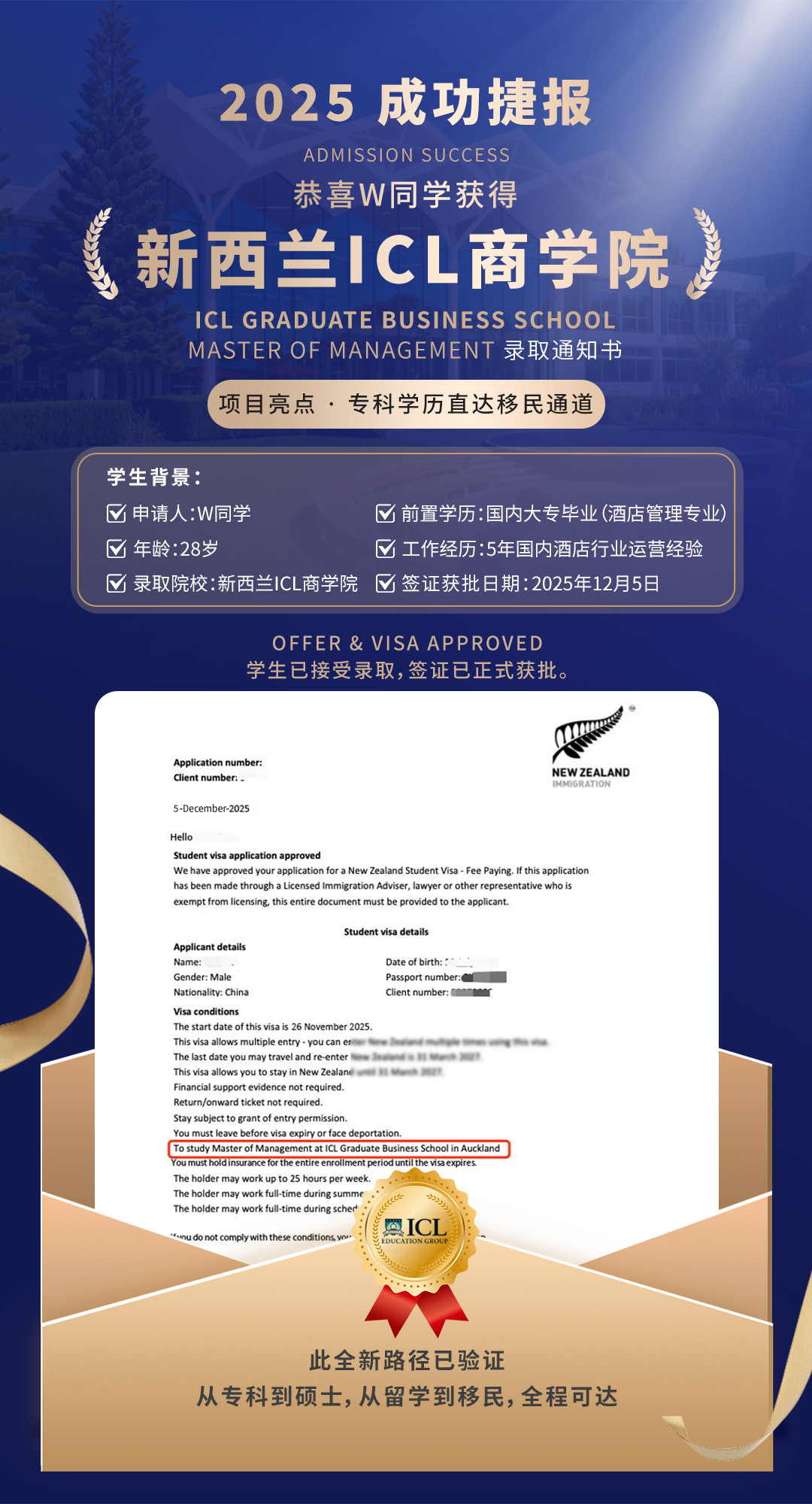关键突破:凭借扎实的行业管理经验,通过专属通道,W同学成功获得免雅思入学资格,直接收获新西兰学历认证局(NZQA)认证的ICL商学院管理硕士录取。